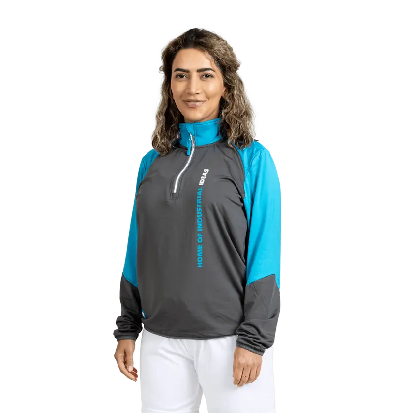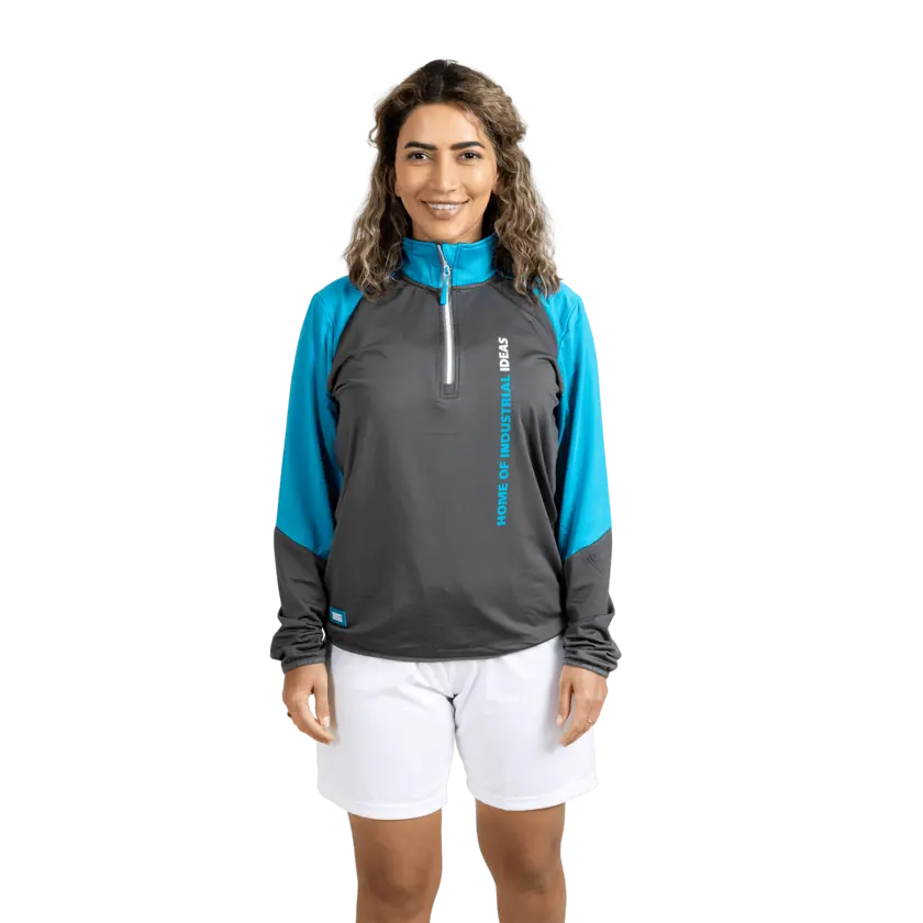 This long-sleeve activewear shirt sewn in ultrasoft, breathable material can be worn on its own or as a baselayer on cooler days. It has a standcollar and half-zip front with reflective details. A small side pocket keeps keys and coins safe.Vertical Home of Industrial Ideas-slogan at the front, small logo at the hem.