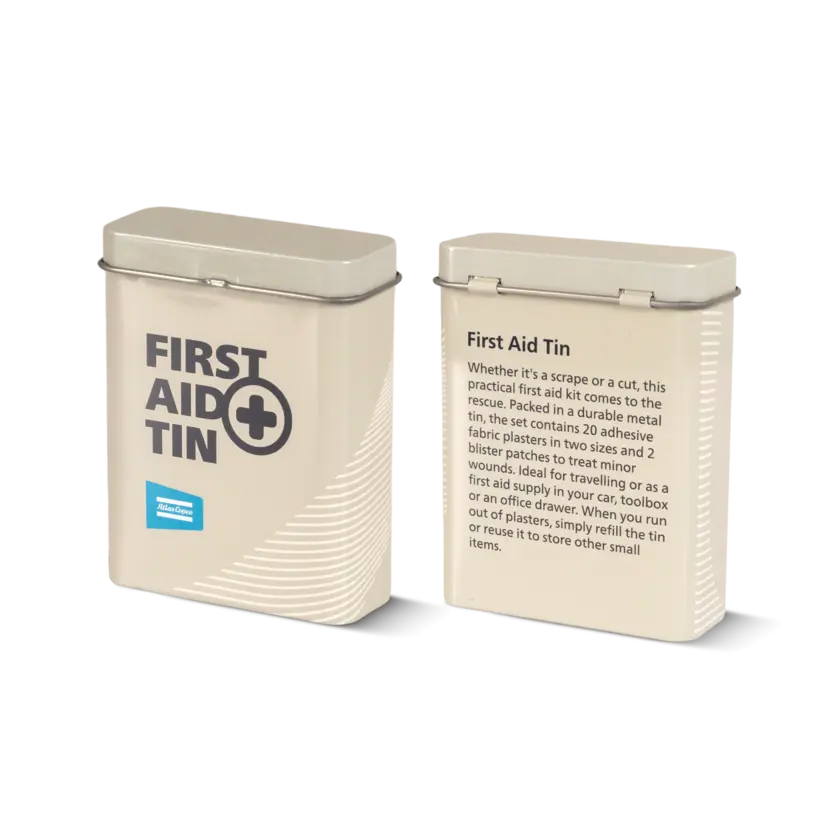 Whether it's a scrape or a cut, this practical first aid kit comes to the rescue. Packed in a durable metal tin, the set contains 20 adhesive fabric plasters in two sizes and 2 blister patches to treat minor wounds. Ideal for travelling or as a first aid supply in your car, toolbox or an office drawer. When you run out of plasters, simply refill the tin or reuse it to store other small items.