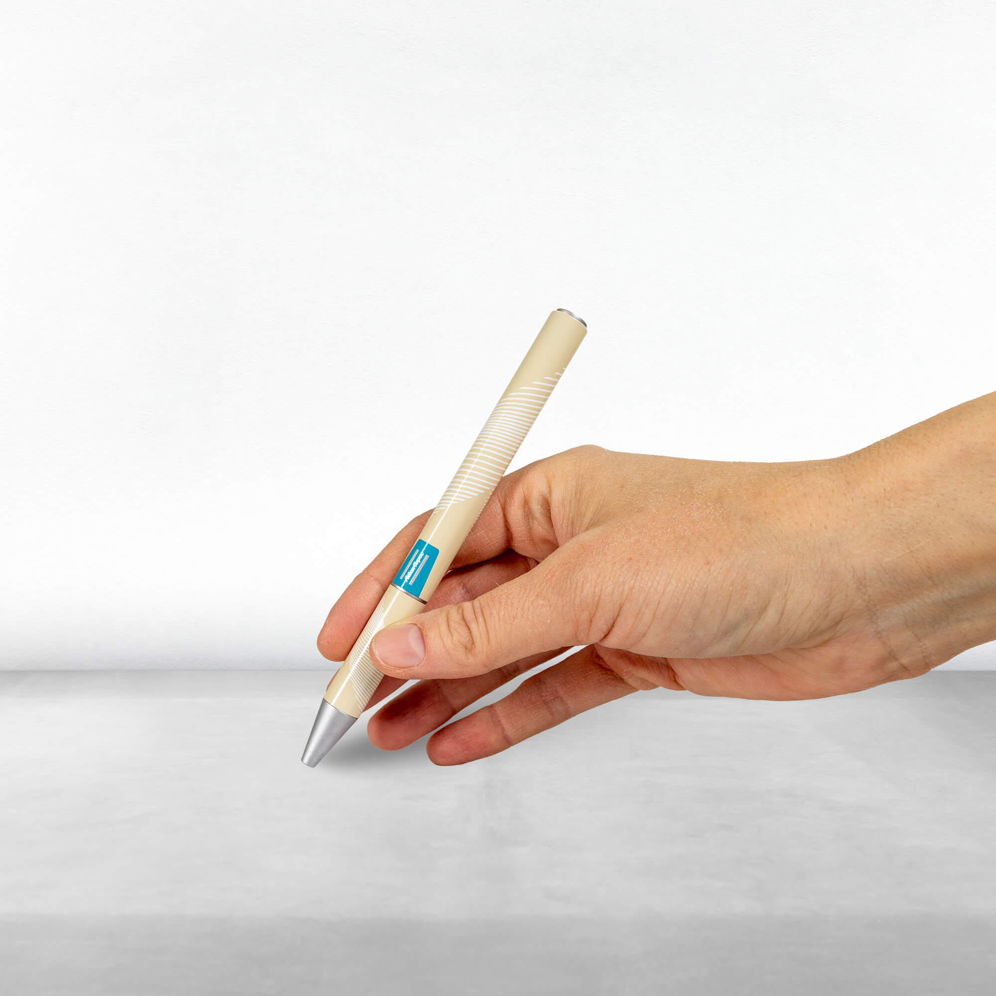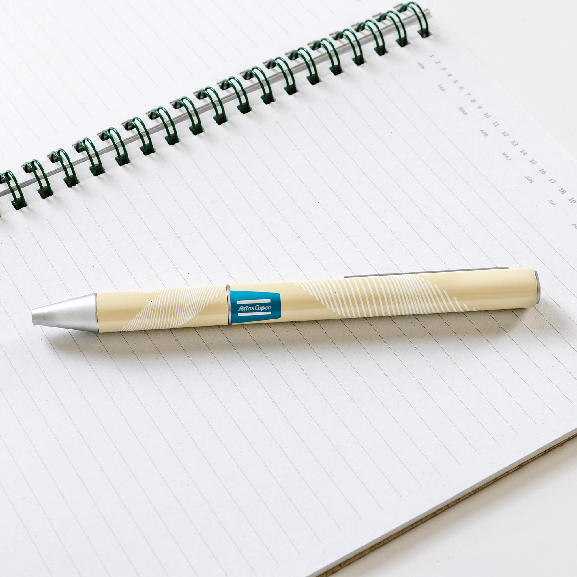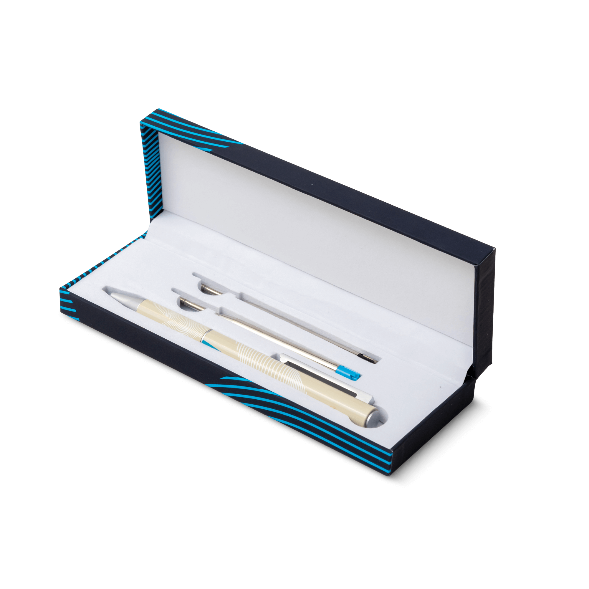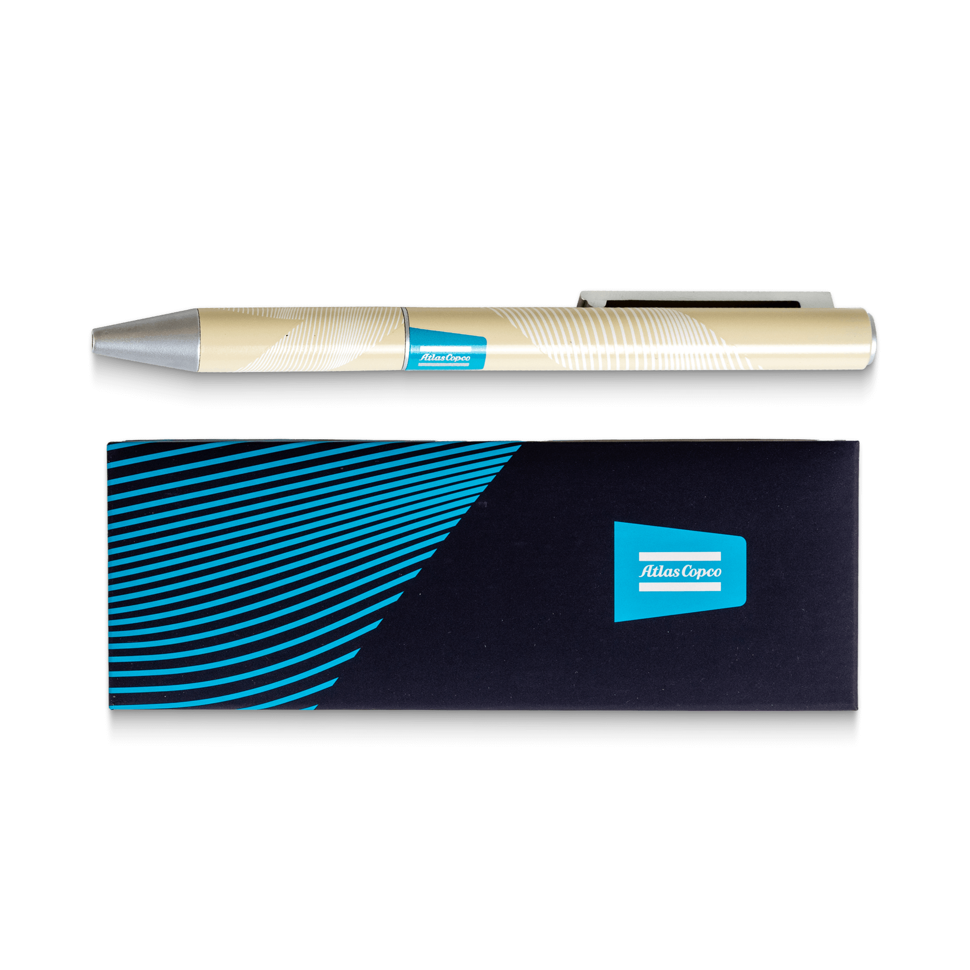 This customized pen has a twist mechanism and an elegant metallic blue body with details in matte chrome. A nice signature gift.