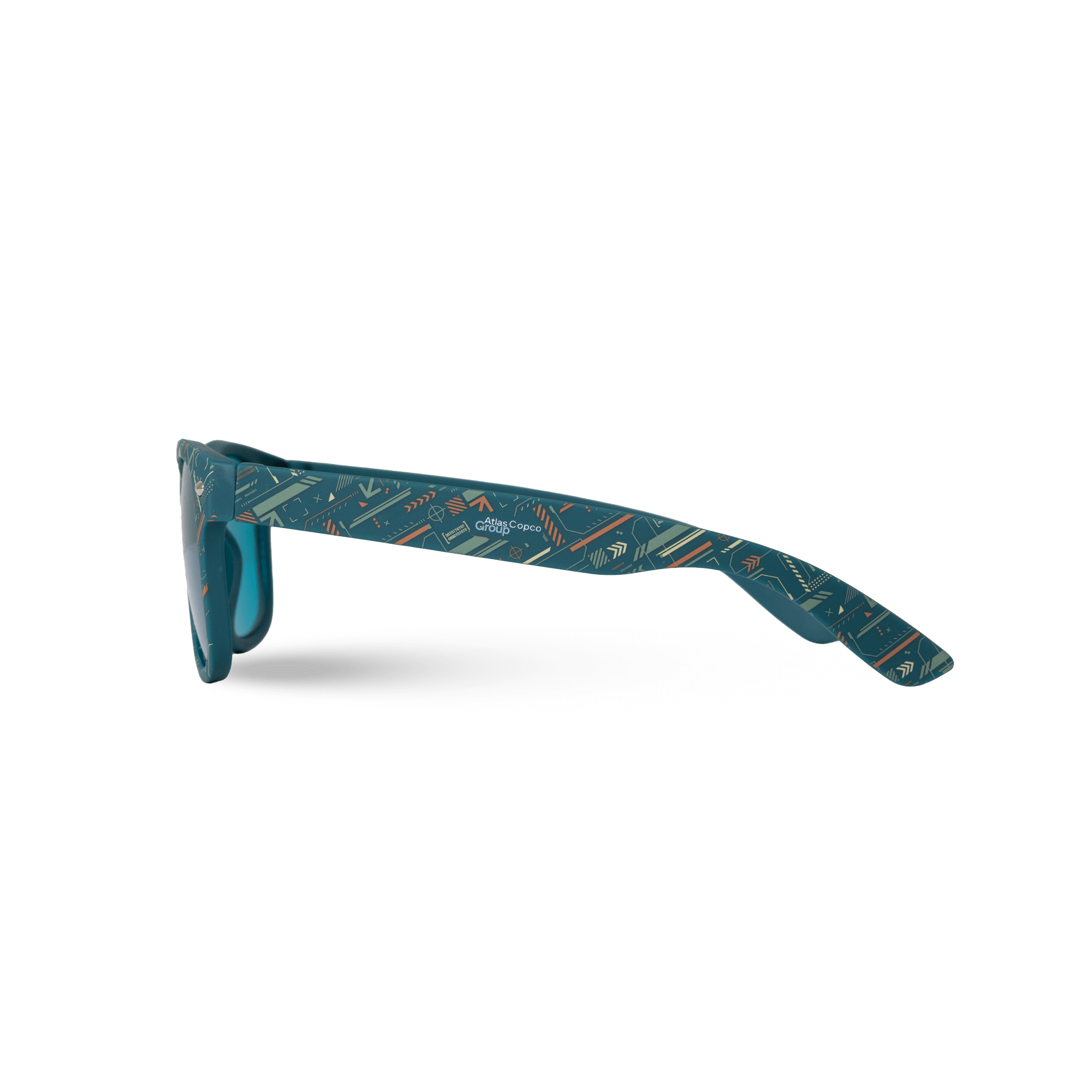 A pair of kids sunglasses made from recycled plastic in a contemporary design. The glasses combine a classic shape with all-over print frames featuring a small logo. The lenses provide UV 400 protection from harmful rays.